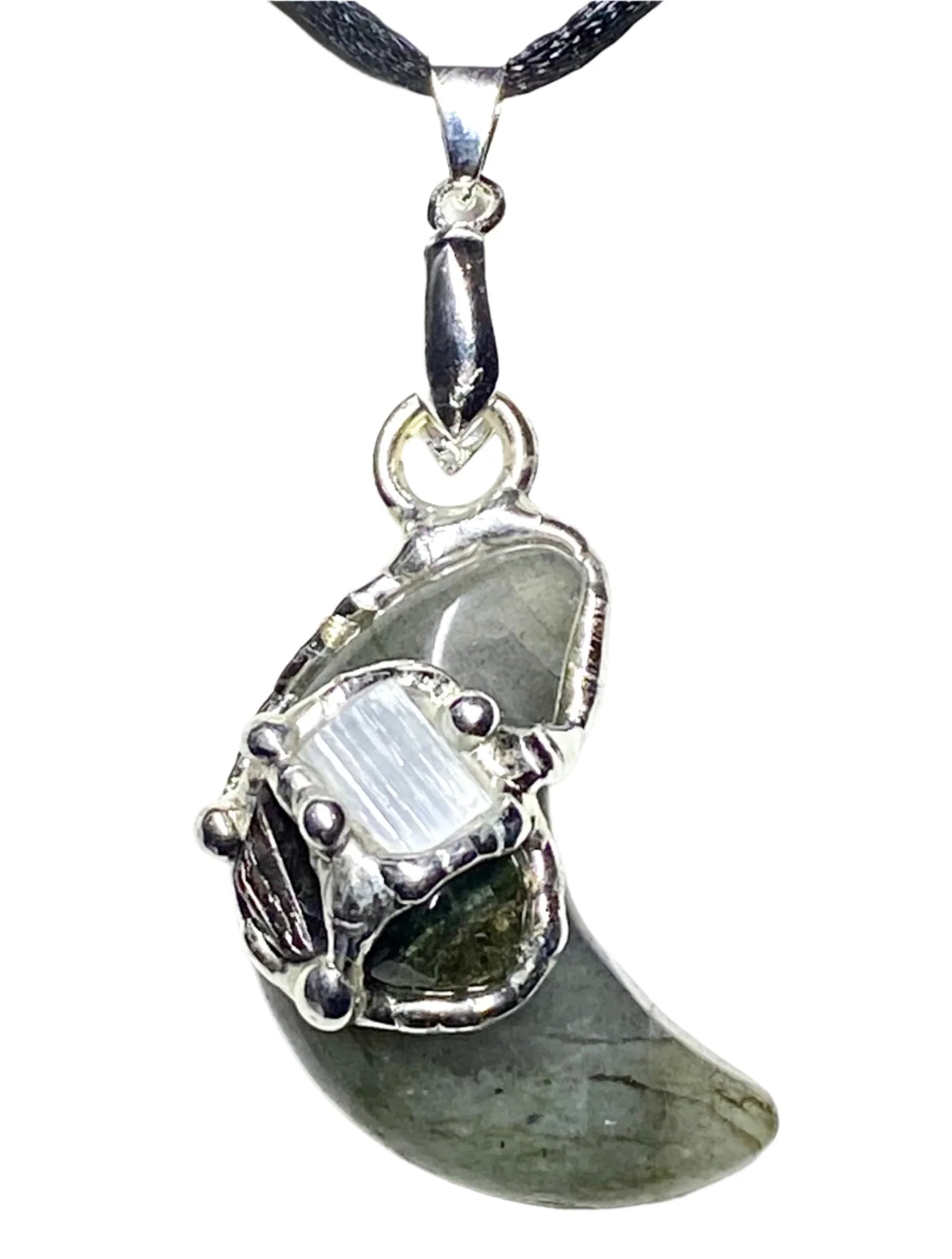 Rainbow Moonstone creates balance in all chakras with the feminine moon energy. Peacock Ore aligns all the chakras and resides at the crown streaming energy throughout the auric field. Yellow Labradorite brings in the masculine sun energy to balance male and female energies. Yellow Labradorite helps with strengthening personal power with confidence.